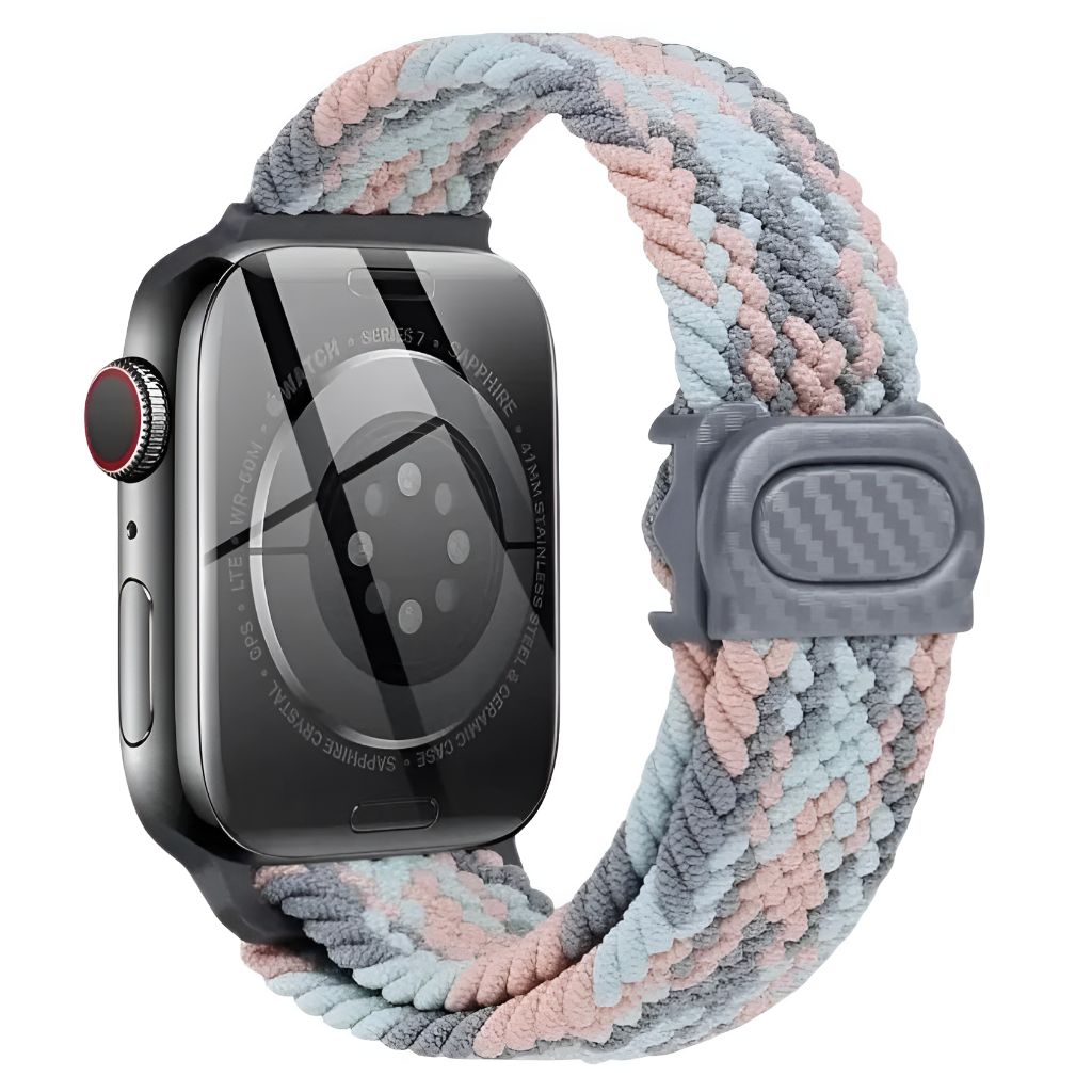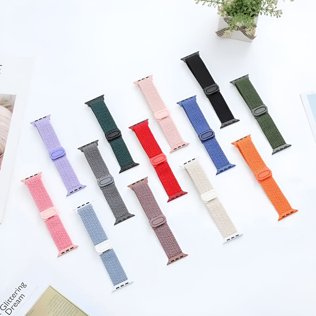 Me encantan estas correas tipo loop para mi Apple Watch. La tela absorbe la humedad, asi que no tengo irritacion debajo de la correa. Tambien se mantiene seca. La he usado en la piscina y funciono sin problemas. El tamano es excelente y se adapta a diferentes munecas. Tengo una muneca grande, asi que encontrar correas que ajusten bien a veces es dificil.