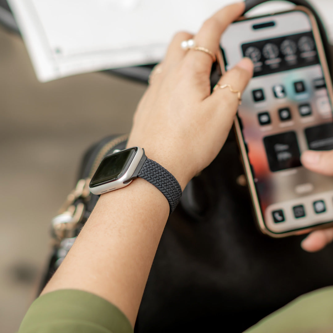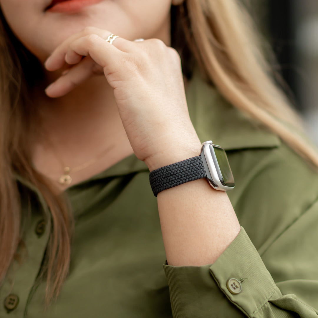 Mejora tu Apple Watch con la elegante y moderna correa Agnovi Bucle Trenzado Elástico. Esta pulsera delgada y elástica de tela añade un toque de sofisticación a tu muñeca mientras mantiene tu reloj seguro en su lugar.