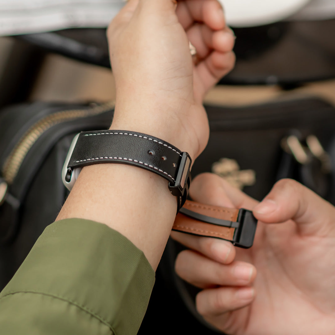 Fabricada en cuero transpirable, brinda una experiencia de uso cómoda, ideal para llevarla todo el día. La conexión de acero inoxidable añade un toque de sofisticación, creando un aspecto pulido y moderno.