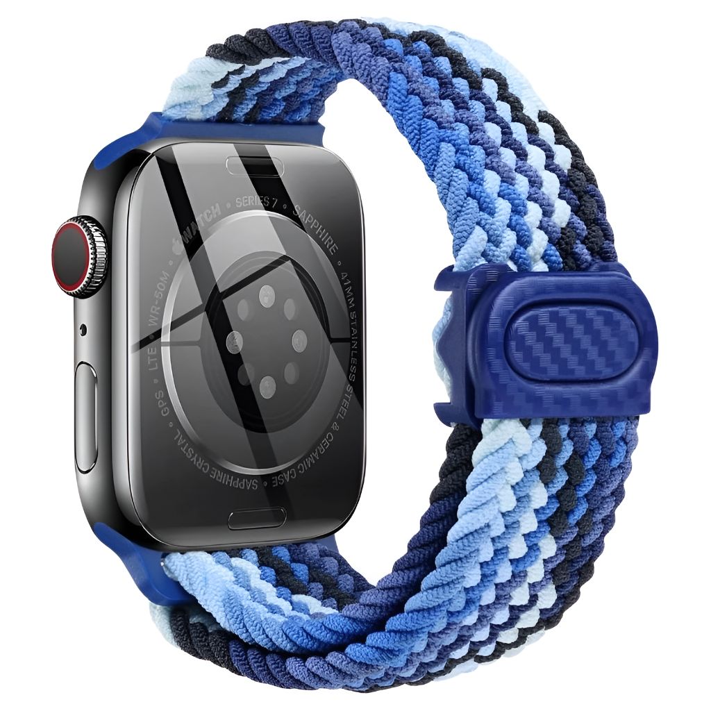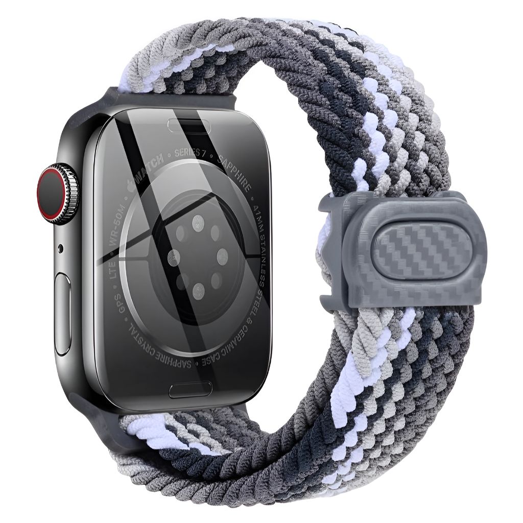 Me encantan estas correas tipo loop para mi Apple Watch. La tela absorbe la humedad, asi que no tengo irritacion debajo de la correa. Tambien se mantiene seca. La he usado en la piscina y funciono sin problemas. El tamano es excelente y se adapta a diferentes munecas. Tengo una muneca grande, asi que encontrar correas que ajusten bien a veces es dificil.